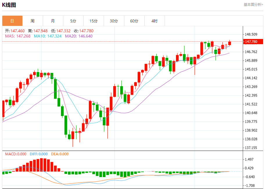 汇价高见147.948,低见147.332。上一交易日,汇价收于147.458。