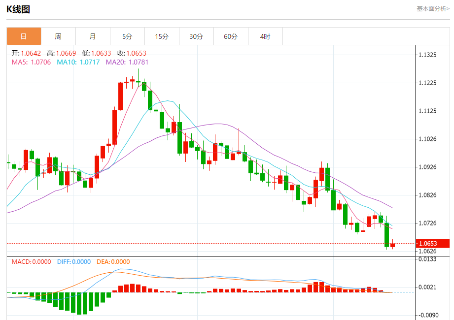 汇价高见1.0669,低见1.0633。上一交易日,汇价收于1.0643。