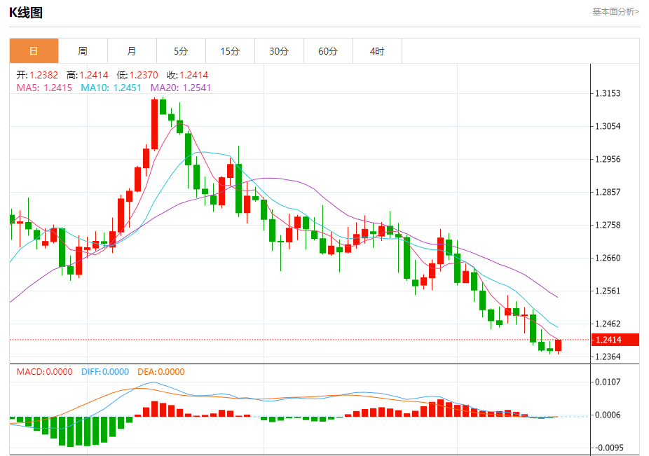 汇价高见1.2411,低见1.2370。上一交易日,汇价收于1.2382。