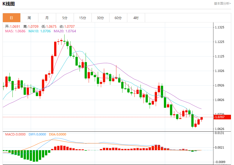 汇价高见1.0709,低见1.0675。上一交易日,汇价收于1.0691。
