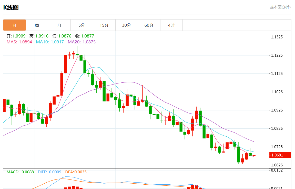周三欧市盘中,欧元/美元最新报1.0688,日图涨0.08%.