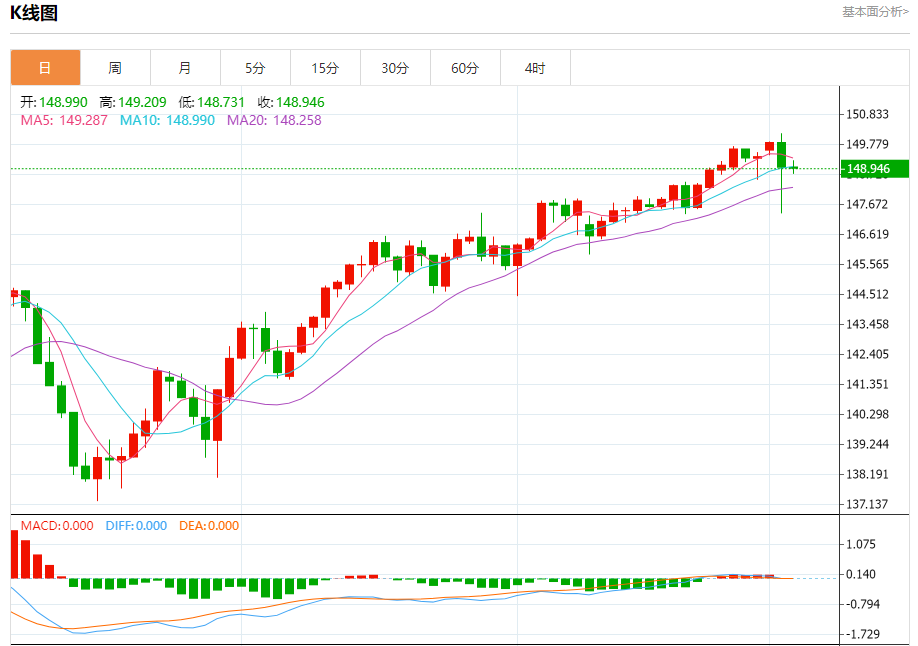 汇价高见149.209,低见148.731。上一交易日,汇价收于148.982。