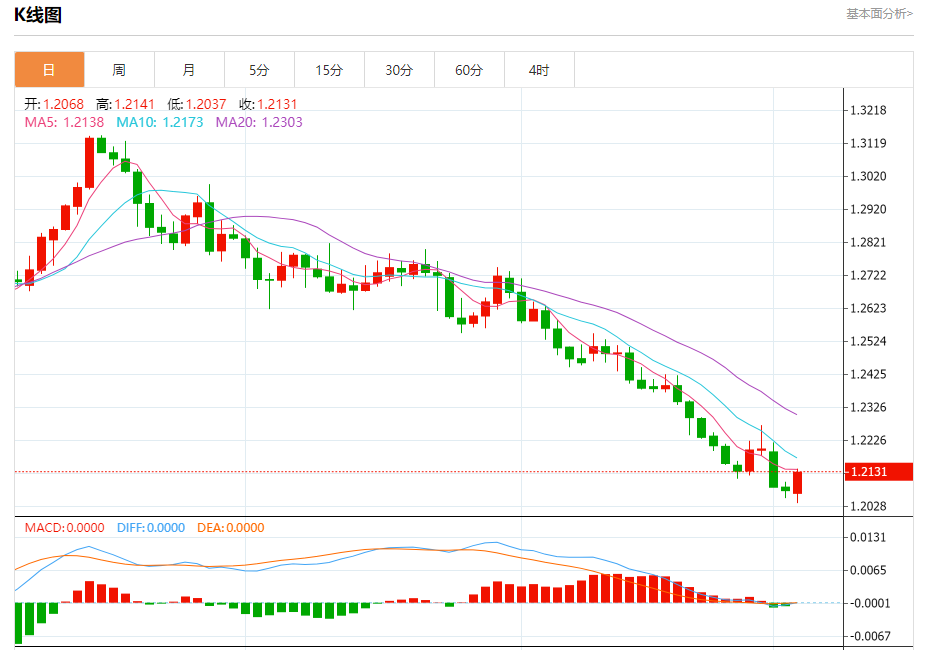 汇价高见1.2141,低见1.2037。上一交易日,汇价收于1.2076。