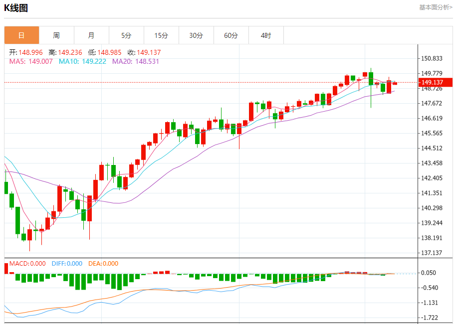 汇价高见149.236,低见148.985。上一交易日,汇价收于149.284。