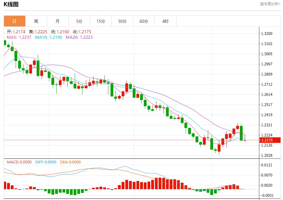汇价高见1.2225,低见1.2160。上一交易日,汇价收于1.2174。
