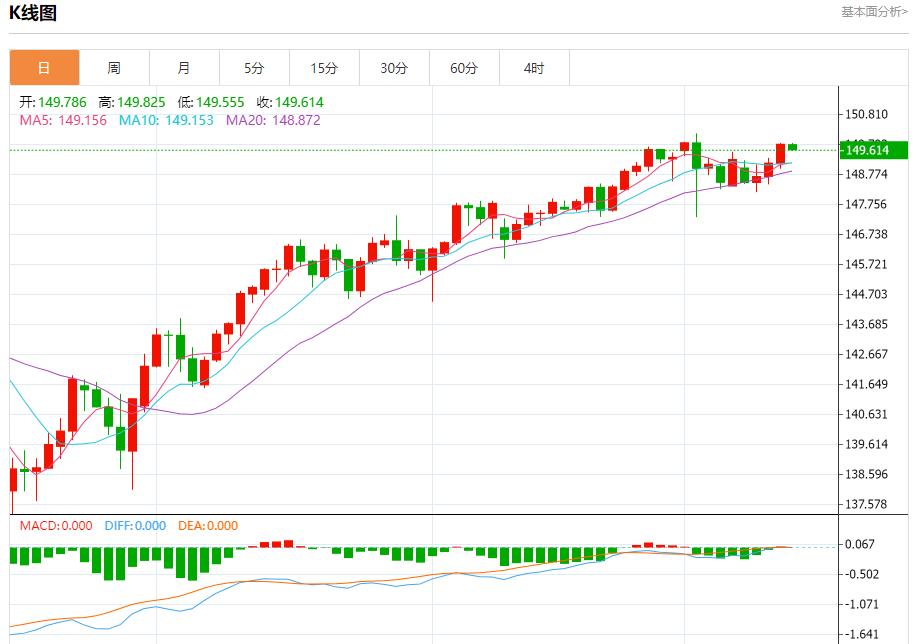 汇价高见149.825,低见149.555。上一交易日,汇价收于149.801。