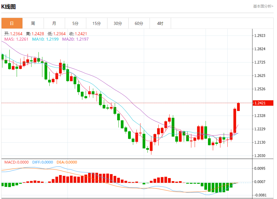 汇价高见1.2428,低见1.2364。上一交易日,汇价收于1.2379。
