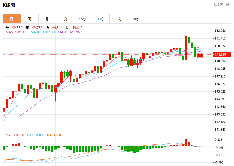汇价高见149.730,低见149.314。上一交易日,汇价收于149.383。