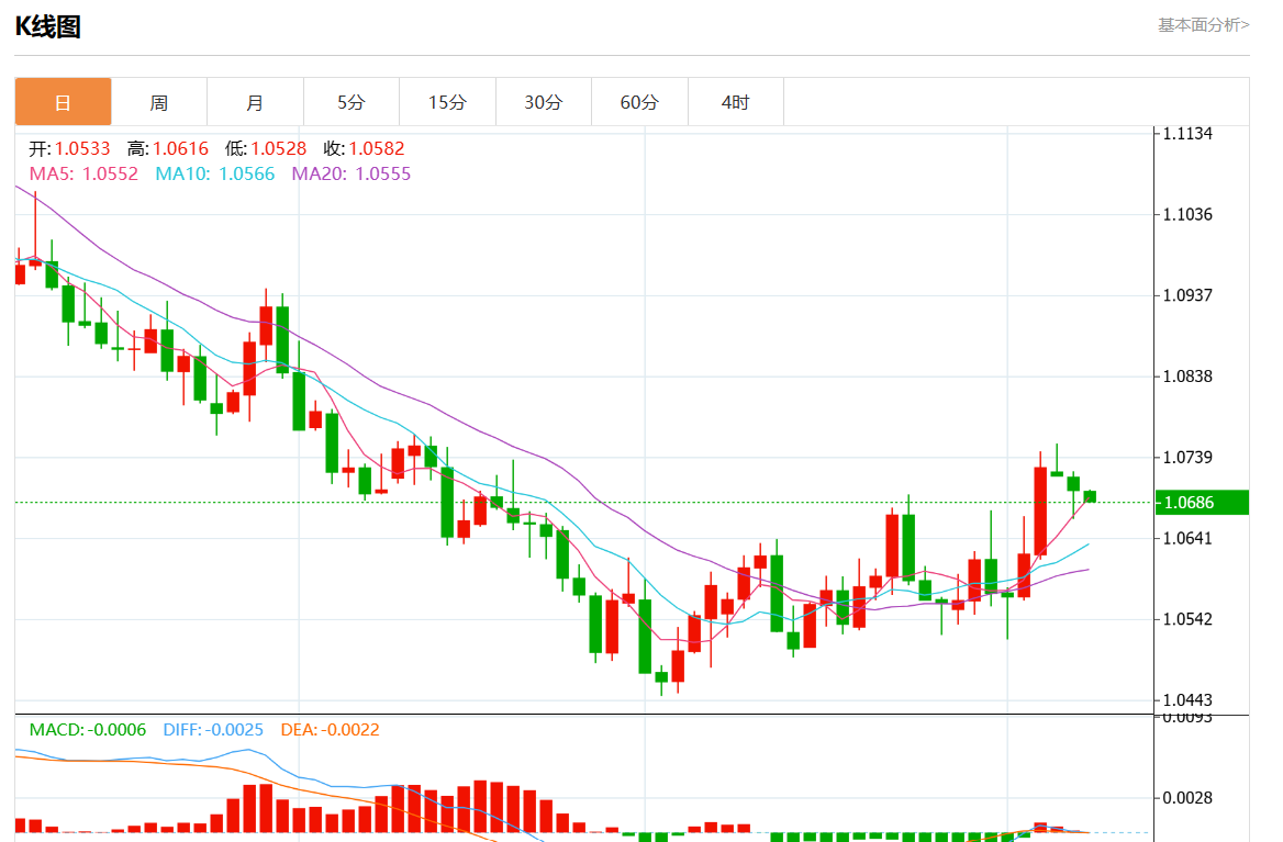 周三欧市盘中,欧元/美元最新报1.0686,日图跌0.13%.