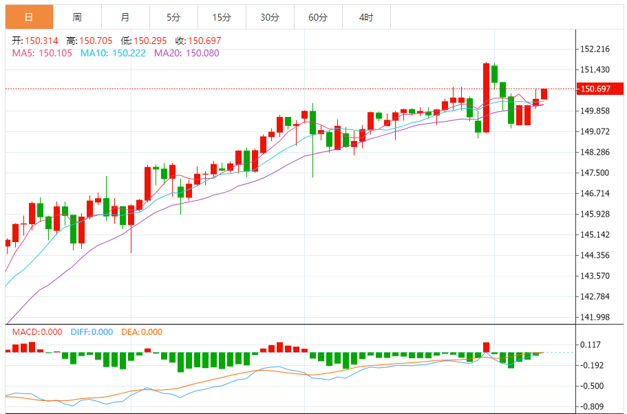 周三(11月8日),美元/日元上涨,暂报150.65,涨幅0.23%。