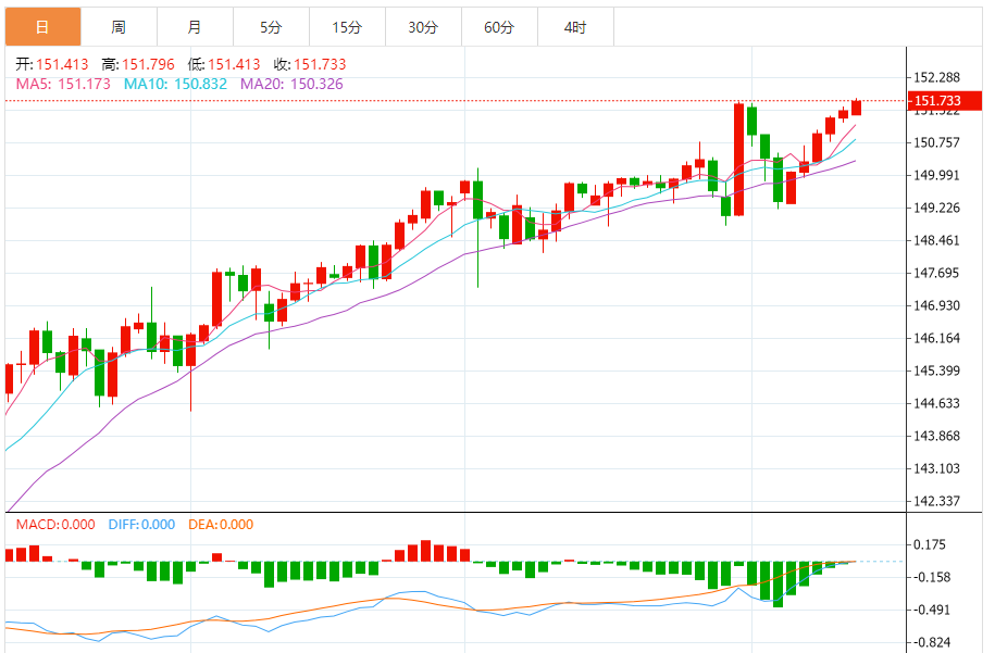 周一(11月13日),美元/日元上涨,暂报151.738,涨幅0.14%。