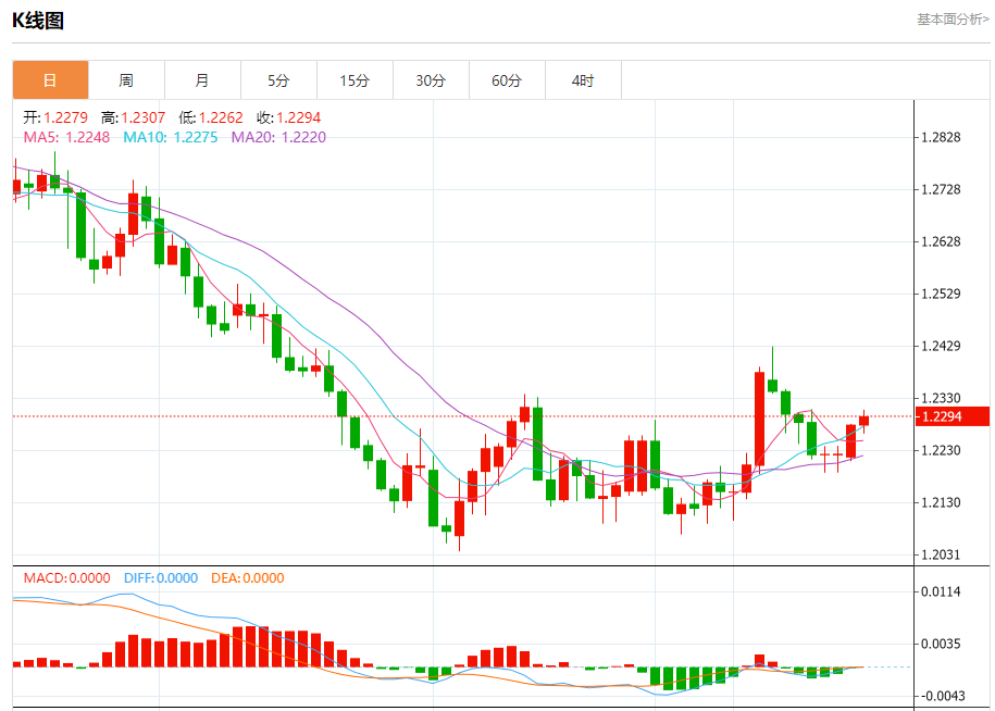 汇价高见1.2307,低见1.2262。上一交易日,汇价收于1.2279。