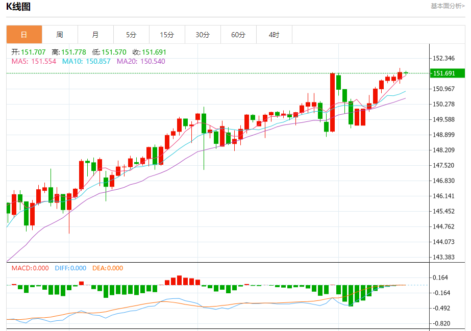 汇价高见151.781,低见151.570。上一交易日,汇价收于151.717。