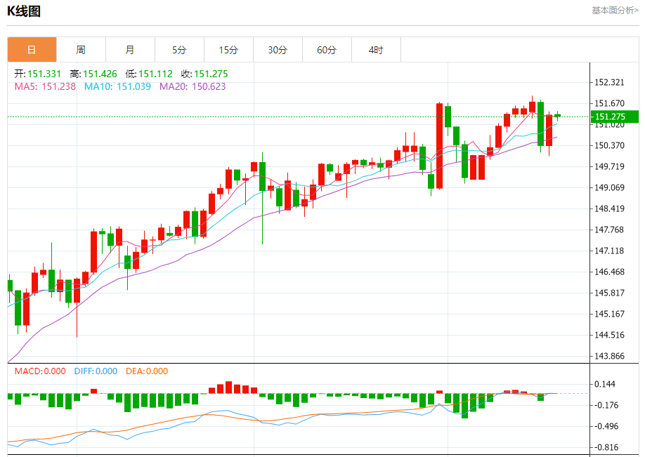 汇价高见151.426,低见151.112。上一交易日,汇价收于151.315。