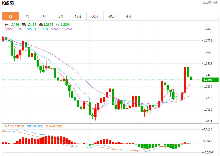 汇价高见1.2424,低见1.2376。上一交易日,汇价收于1.2415。