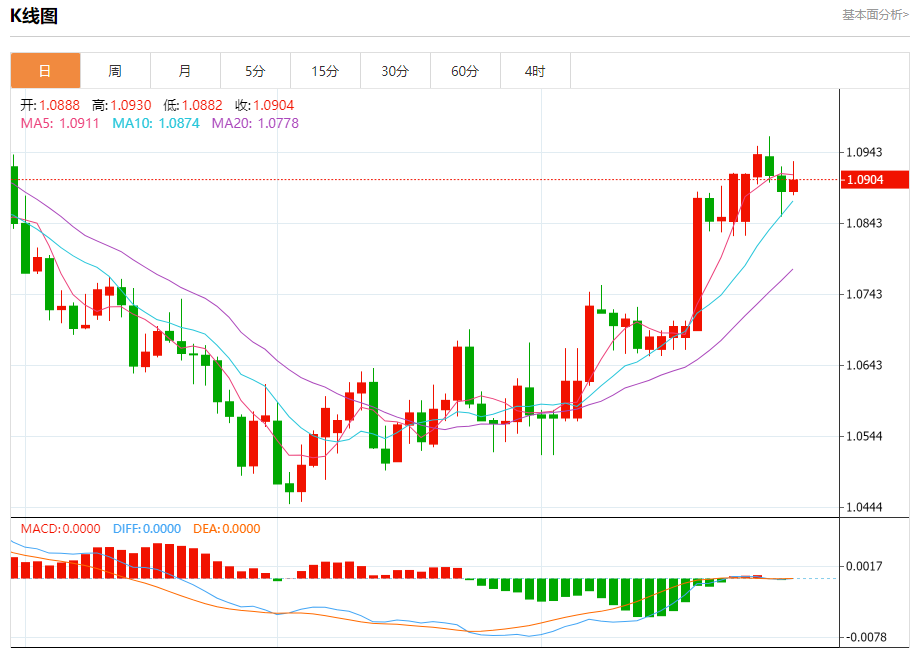 汇价高见1.0930,低见1.0882。上一交易日,汇价收于1.0888。
