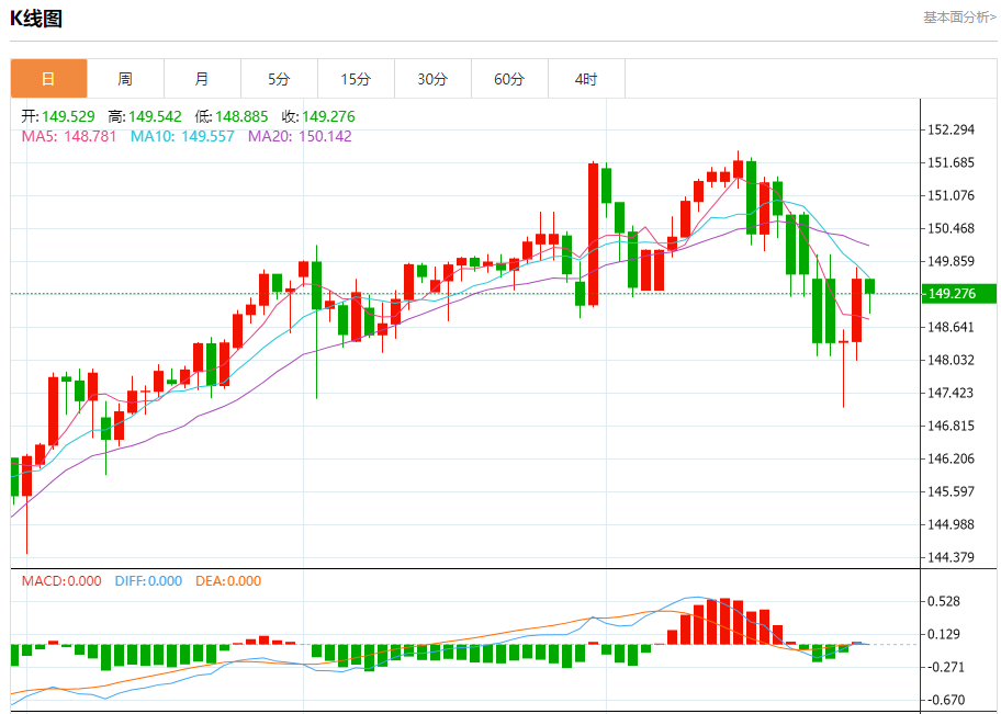 汇价高见149.542,低见148.885。上一交易日,汇价收于149.531。