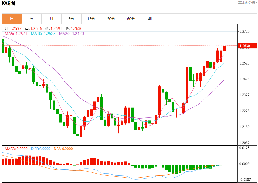 汇价高见1.2636,低见1.2591。上一交易日,汇价收于1.2601。
