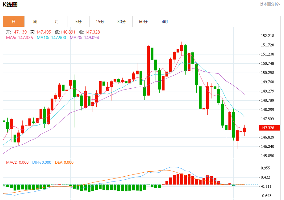 汇价高见147.495,低见146.891。上一交易日,汇价收于147.142。