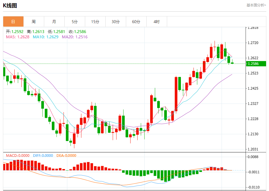 汇价高见1.2613,低见1.2581。上一交易日,汇价收于1.2591。