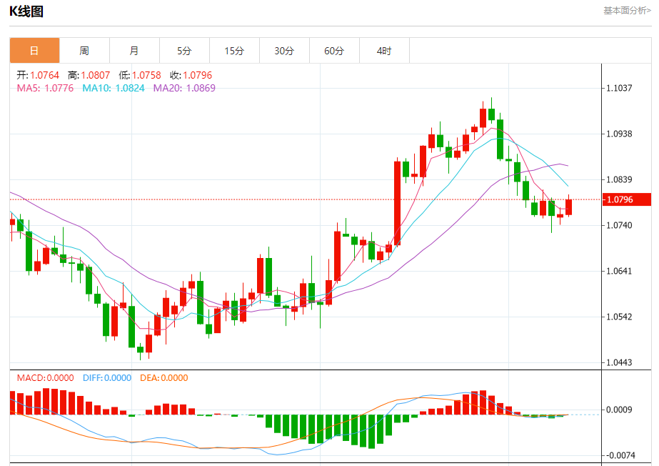 汇价高见1.0807,低见1.0758。上一交易日,汇价收于1.0764。