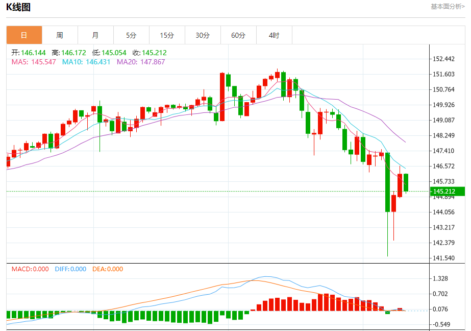 汇价高见146.172,低见145.053。上一交易日,汇价收于146.142。