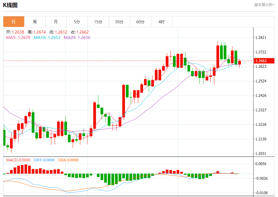 汇价高见1.2674,低见1.2612。上一交易日,汇价收于1.2637。