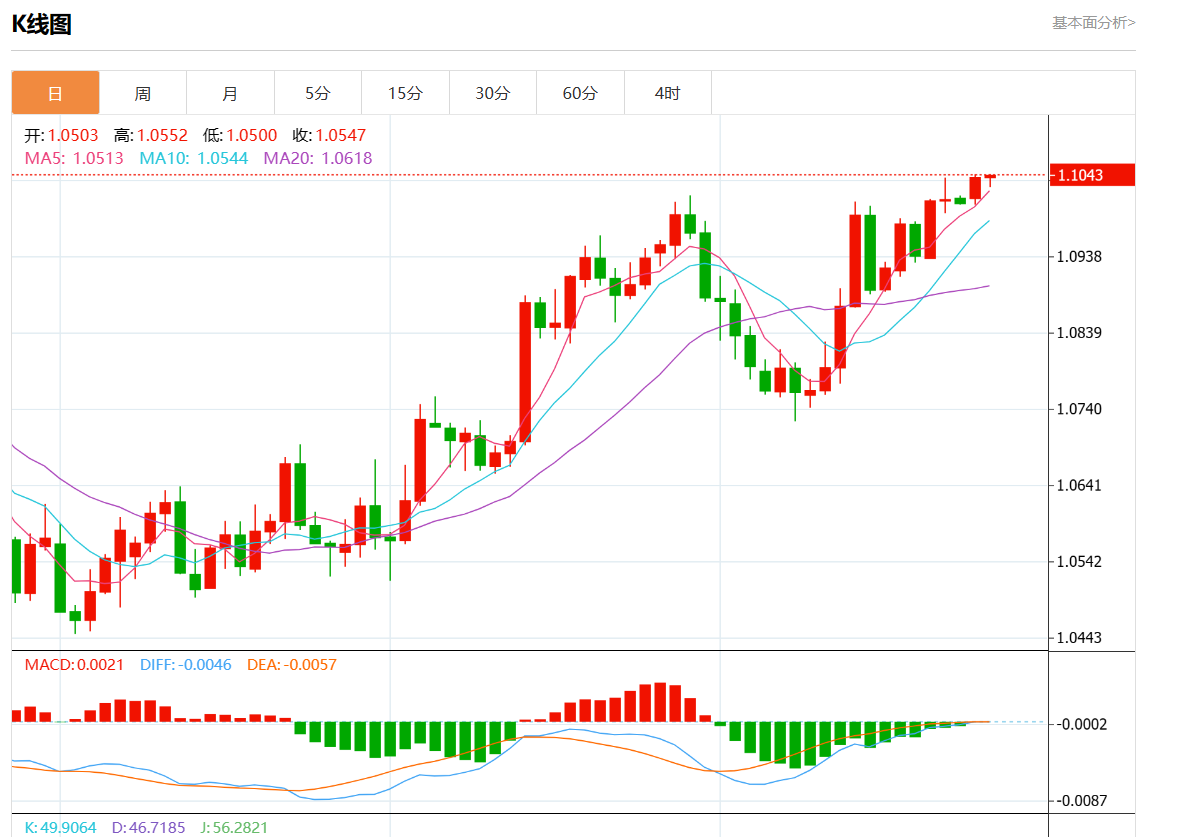 周三欧市盘中,欧元/美元最新报1.1043,日图涨0.01%.