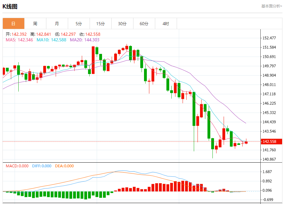 汇价高见142.841,低见142.296。上一交易日,汇价收于142.391。