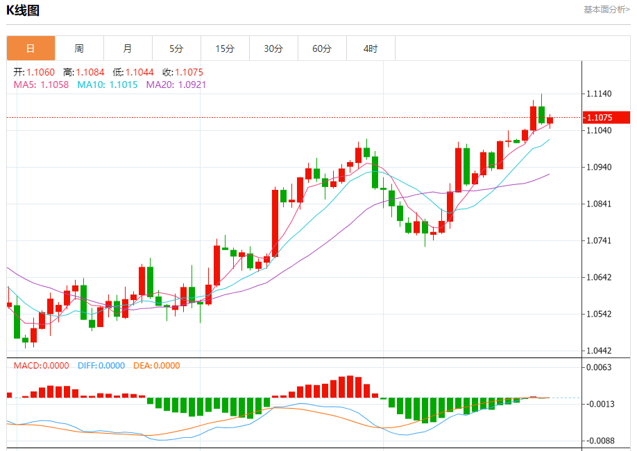 汇价高见1.1084,低见1.1044。上一交易日,汇价收于1.1061。