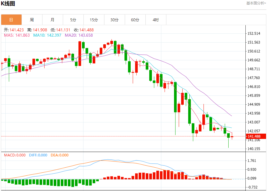 汇价高见141.908,低见141.131。上一交易日,汇价收于141.365。