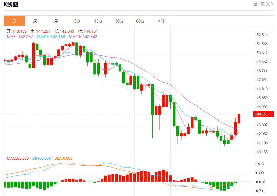 汇价高见144.291,低见142.849。上一交易日,汇价收于143.284。