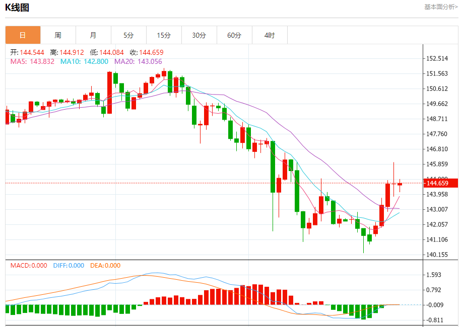 汇价高见144.912,低见144.082。上一交易日,汇价收于144.620。