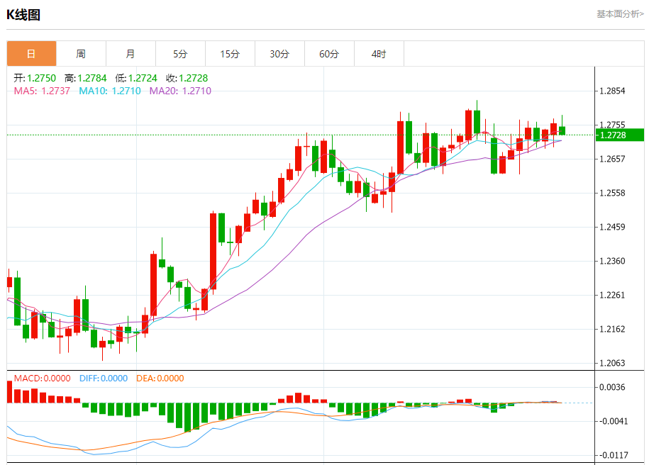 汇价高见1.2784,低见1.2724。上一交易日,汇价收于1.2760。