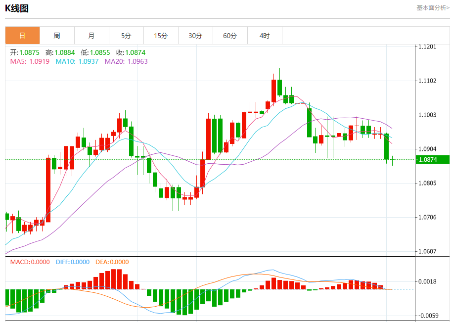 汇价高见1.0884,低见1.0855。上一交易日,汇价收于1.0875。