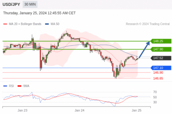 在 147.10 之上,看涨,目标价位为 147.90 ,然后为 148.25 。