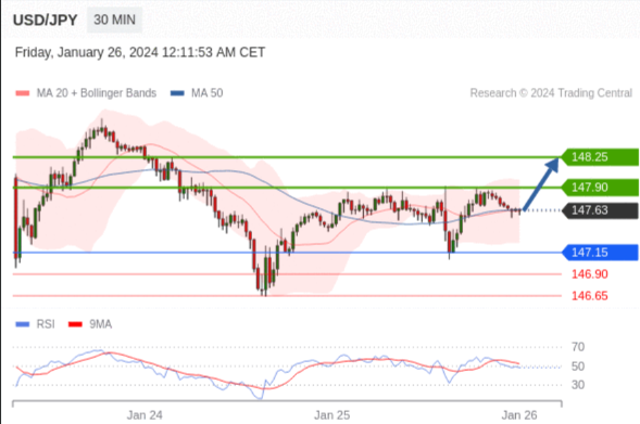在 147.15 之上,看涨,目标价位为 147.90 ,然后为 148.25 。