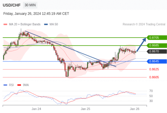 在 0.8645 之上,看涨,目标价位为 0.8685 ,然后为 0.8705 。