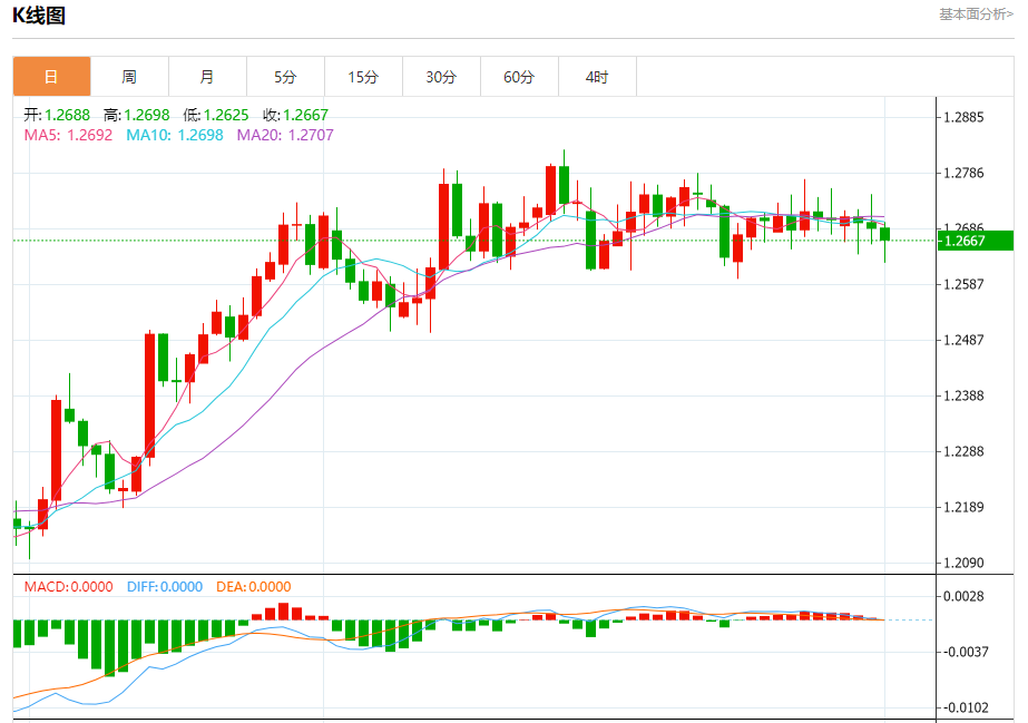 汇价高见1.2698,低见1.2625。上一交易日,汇价收于1.2688。