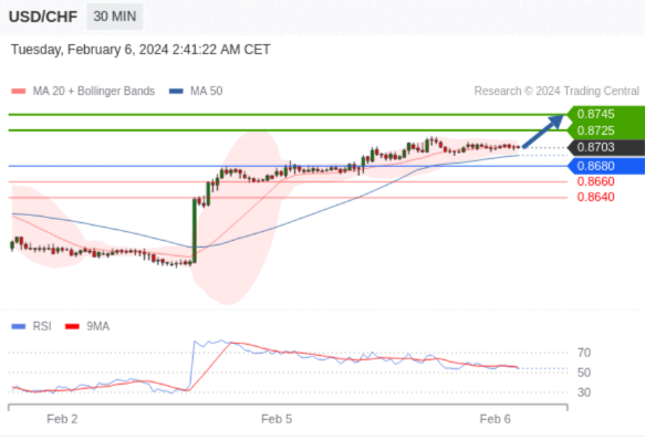 在 0.8680 之上,看涨,目标价位为 0.8725 ,然后为 0.8745 。