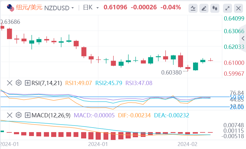 纽元/美元货币对的技术分析表明,市场势头不温不火。移动平均收敛散度(MACD)线位于中心线上,显示信号线下方的离度。然而,滞后指标14天相对强弱指数(RSI)低于50水平,表明纽元/美元货币对的情绪较弱。