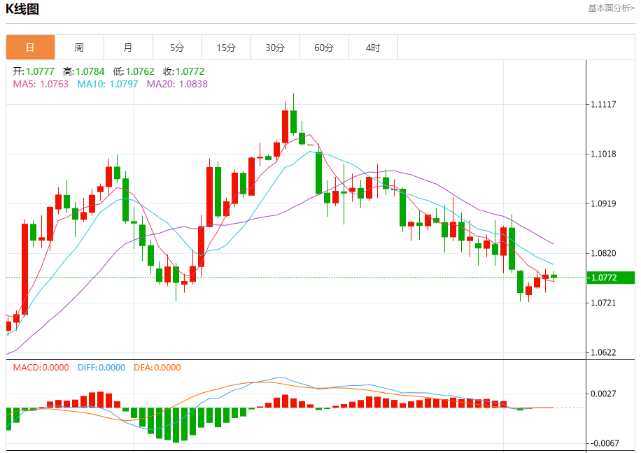 汇价高见1.0784,低见1.0762。上一交易日,汇价收于1.0777。