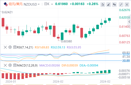 新西兰储备银行(RBNZ)行长阿德里安-奥尔(AdrianOrr)最近的言论进一步刺激了市场对央行将推迟下调基准利率的猜测,新西兰元(NZD)也从中受益。奥尔表示,通胀正朝着正确的方向发展,但要使通胀预期真正锚定在2%的水平上,还有更多的工作要做。最新调查显示,两年期通胀预期升至3.2%,而之前预计的增长率为3.0%。