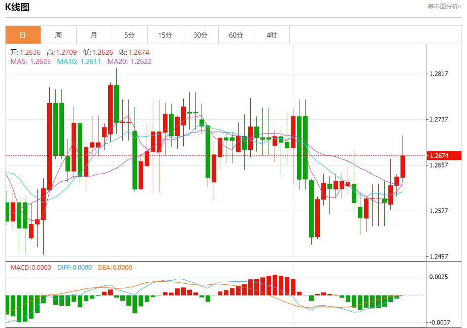 汇价高见1.2709,低见1.2626。上一交易日,汇价收于1.2637。