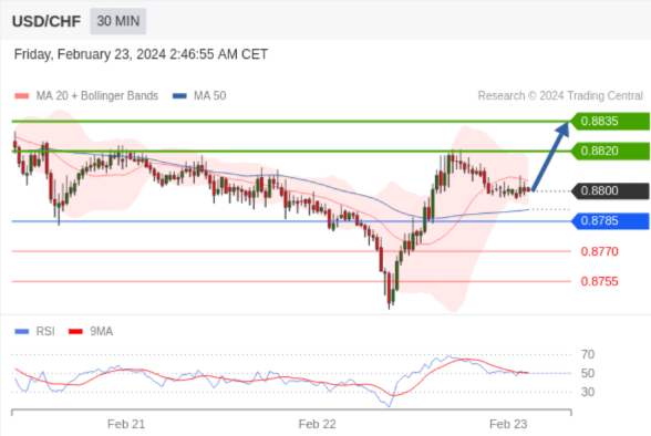 在 0.8785 之上,看涨,目标价位为 0.8820 ,然后为 0.8835 。