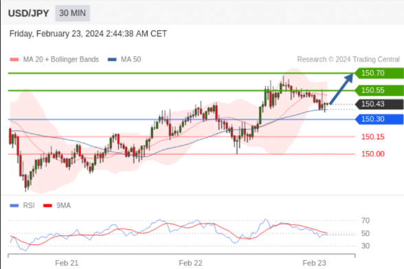 在 150.30 之上,看涨,目标价位为 150.55 ,然后为 150.70 。
