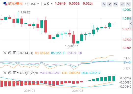 技术分析表明,欧元/美元货币对的看涨情绪。14天相对强弱指数(RSI)位于50关口上方,表明上升势头强劲。