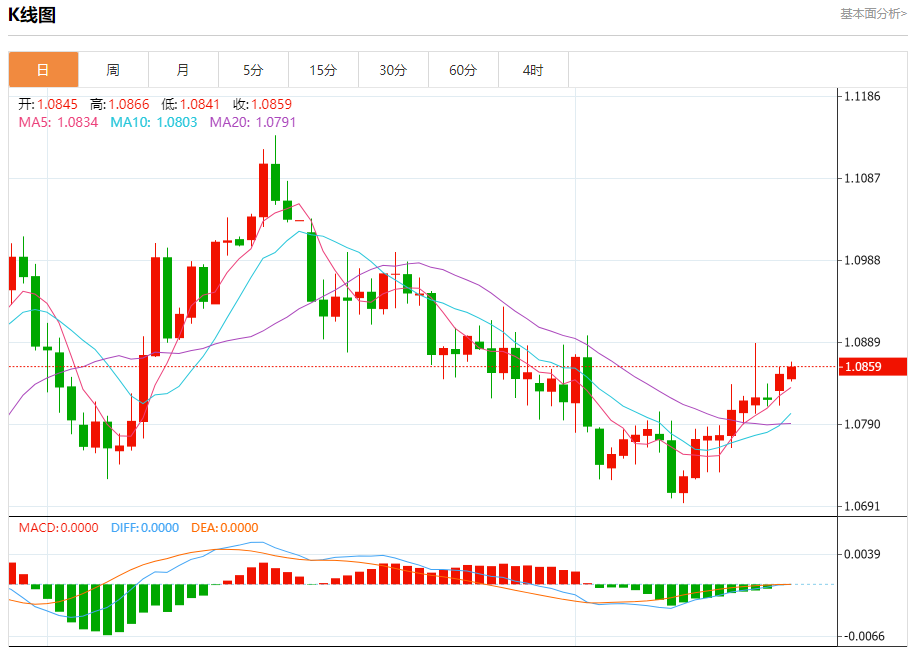 汇价高见1.0866,低见1.0841。上一交易日,汇价收于1.0851。