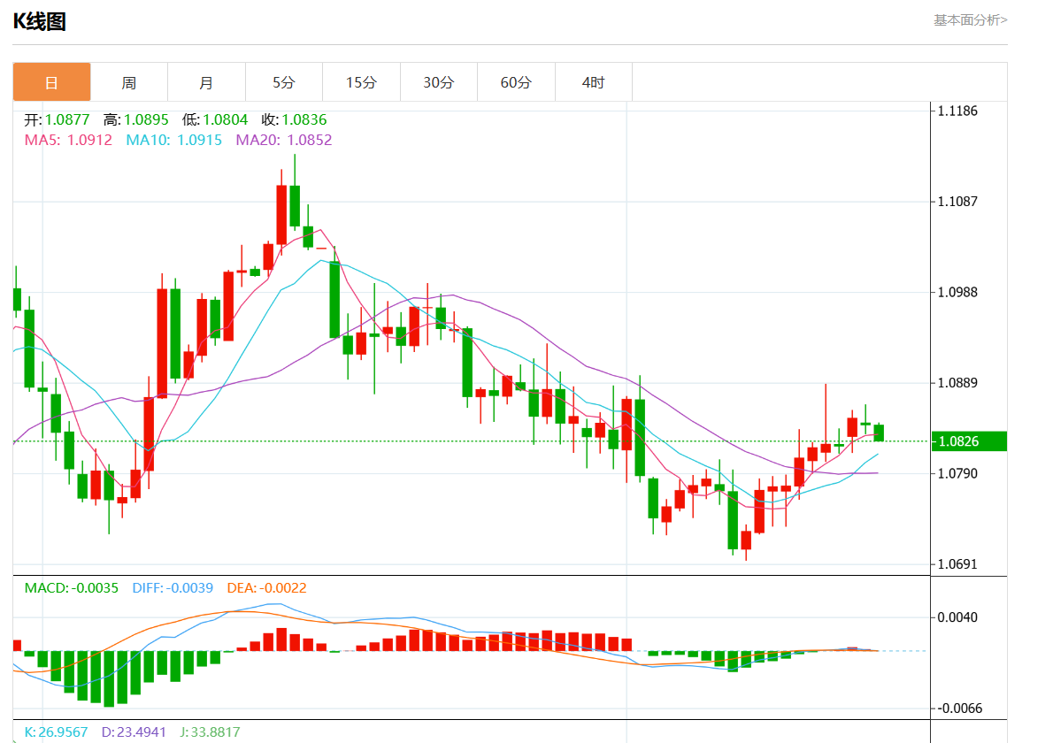 周三欧市盘中,欧元/美元最新报1.0826,日图跌0.17%.