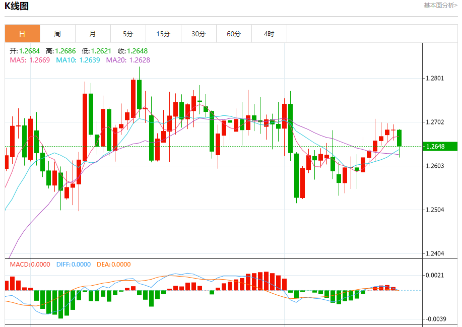 汇价高见1.2686,低见1.2621。上一交易日,汇价收于1.2684。
